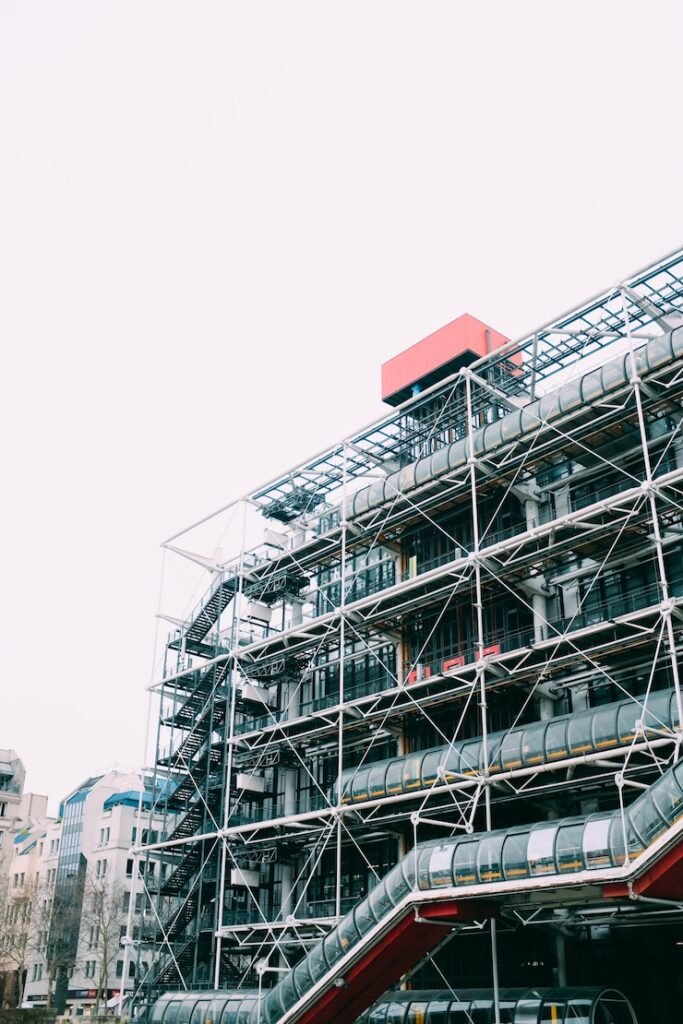 Customized facade scaffolding designed for painting and lighting installations.